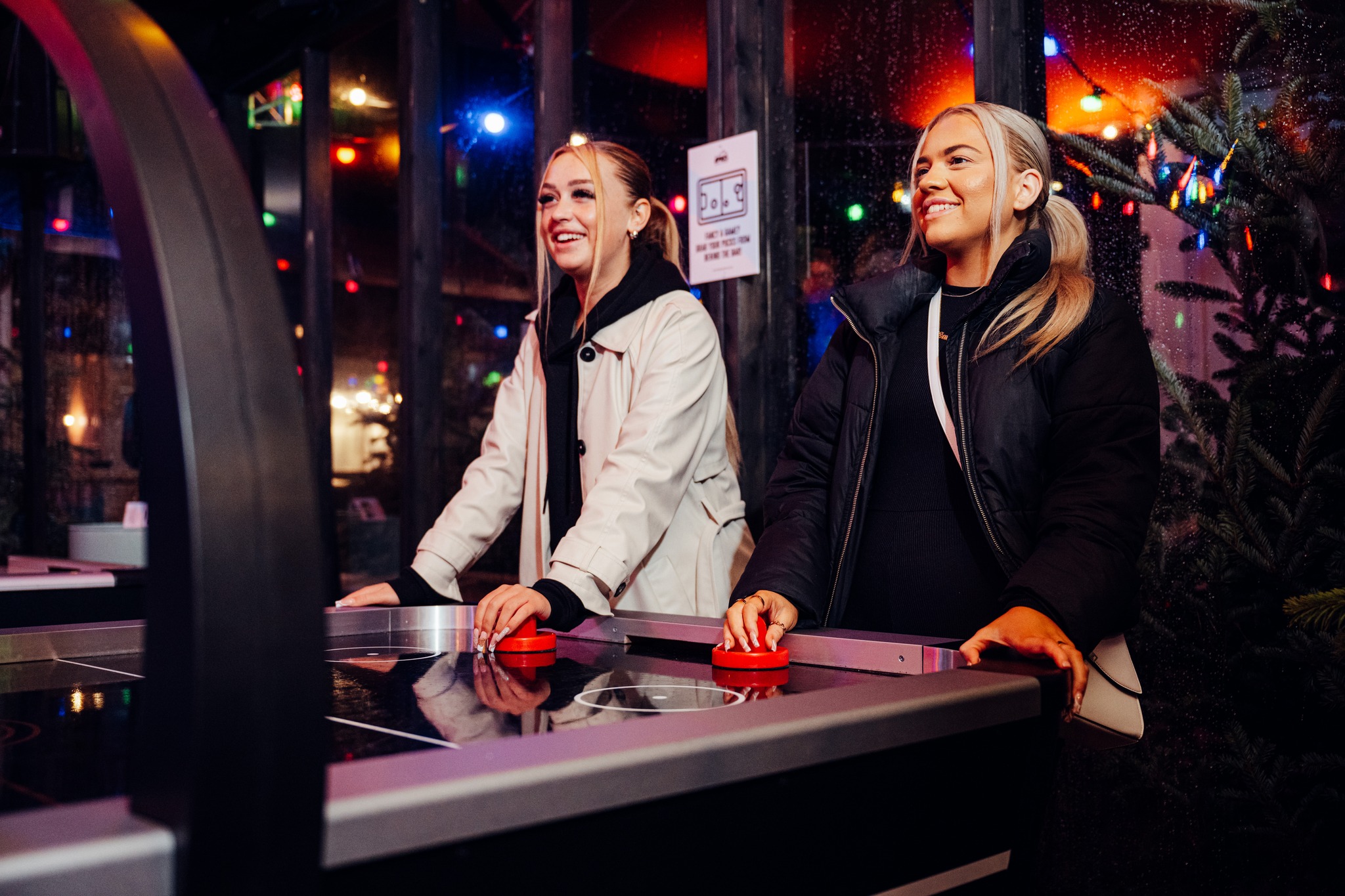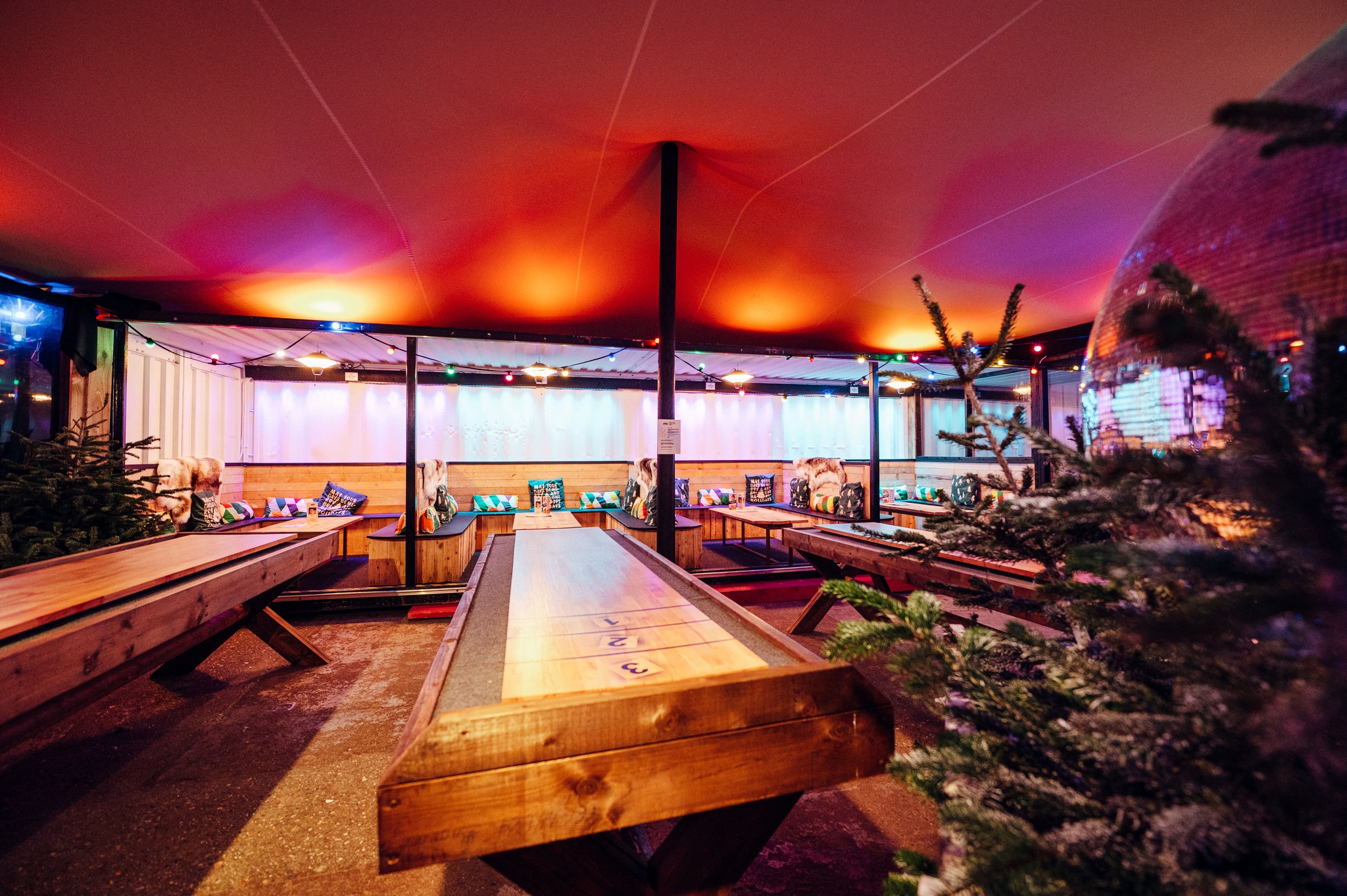 With our Container VIP booths and Stretch Tent providing the base, it was time to bring the area to life as Seventa combined our Picnic Benches and Colourful Oil Drums with a selection of Air Hockey, Table Football and Shuffleboard tables to create the ultimate festive party pop-up space.